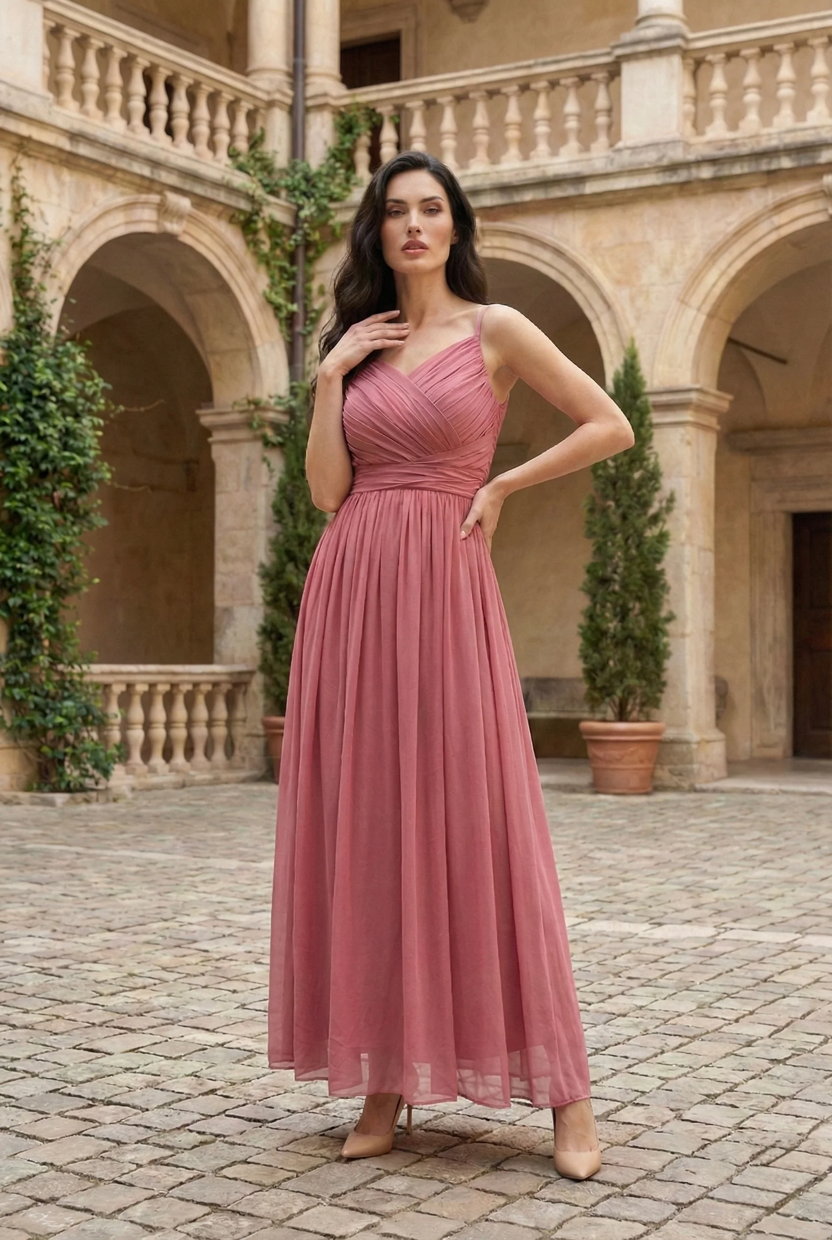 - Delicate pleated bodice with wrap-style detailing