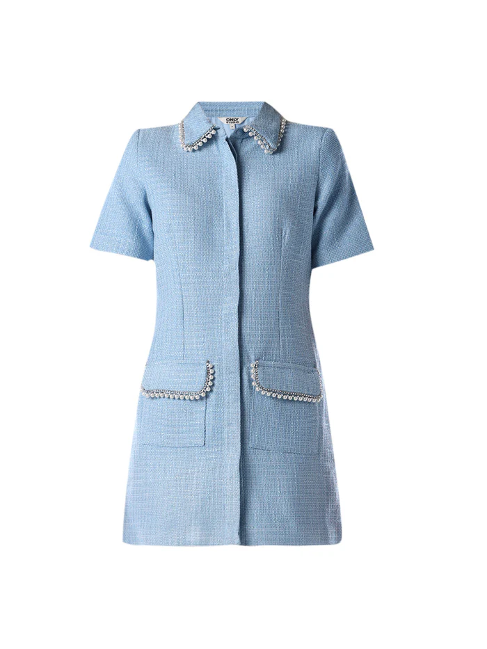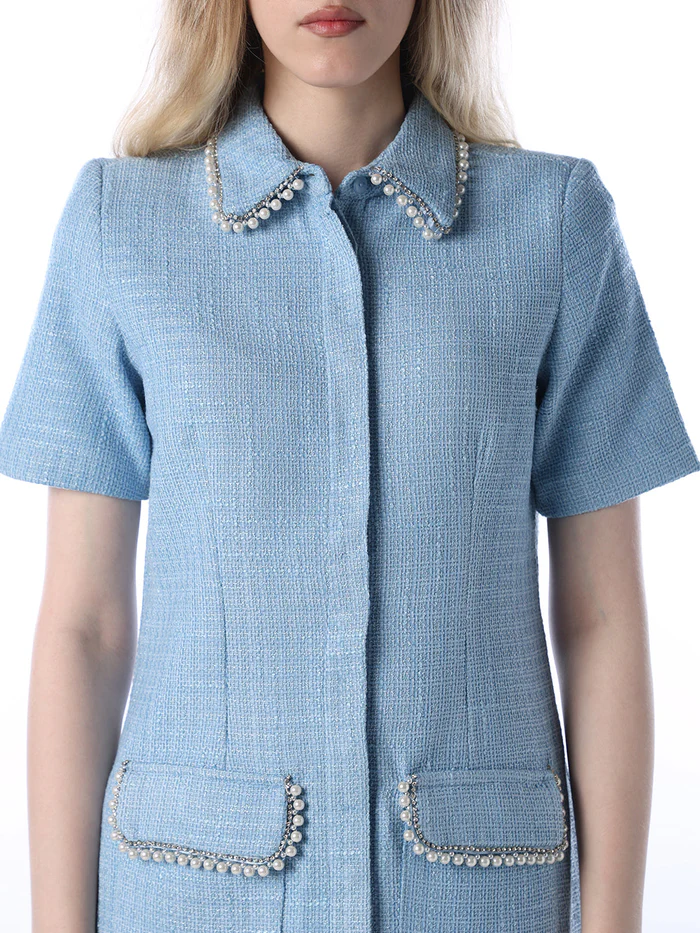 This short, fitted shirt dress is crafted from a textured fabric and features a statement collar with rhinestone embellishments. Designed with a clean button-down front and short sleeves, it creates a sharp yet feminine silhouette. Style note: Style it with pointed heels or ankle boots for a polished