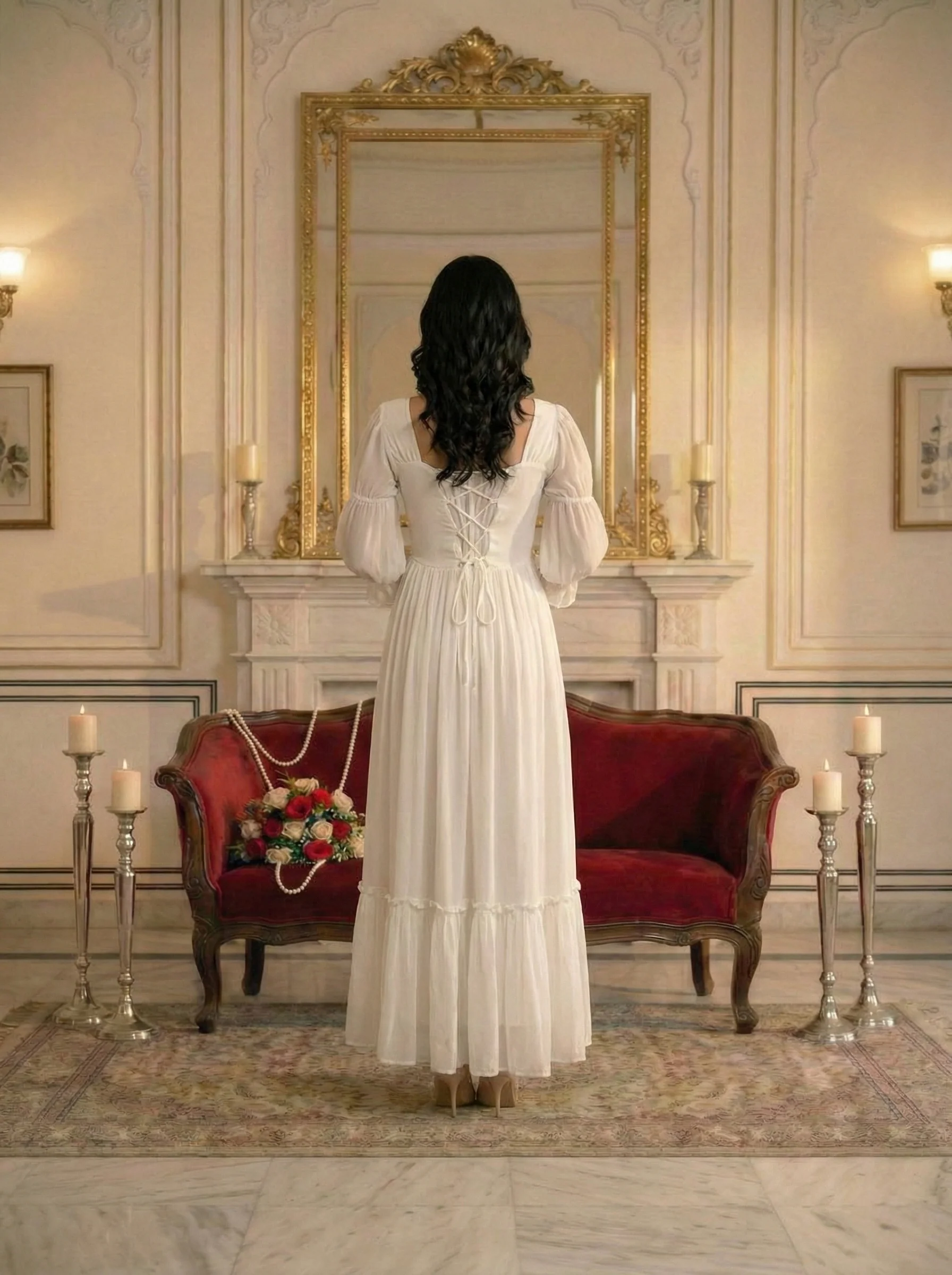 - Style hair in soft waves or a romantic updo to complement the feminine silhouette