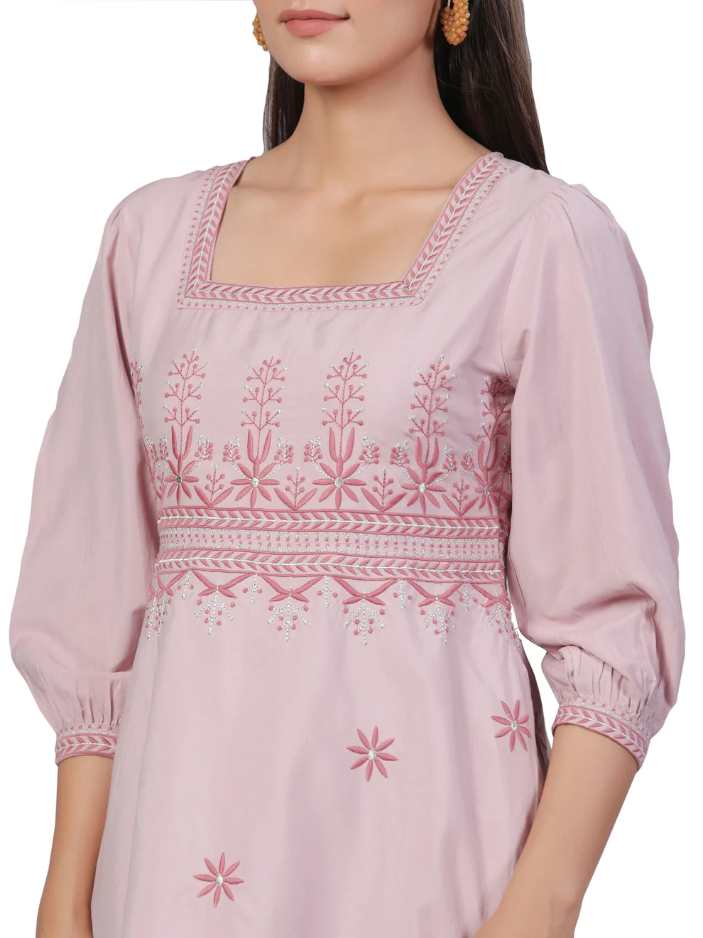 Add a tint of lavish ethnicity to your look with this Light Pink Embroidered Cotton Mulmul Dress. The Light Pink cotton mulmul dress has thread embroidery, a round neckline with a slit, 3/4th sleeves, and gathered detailing. It comes with an attached cotton lining.